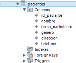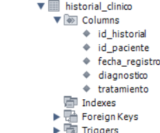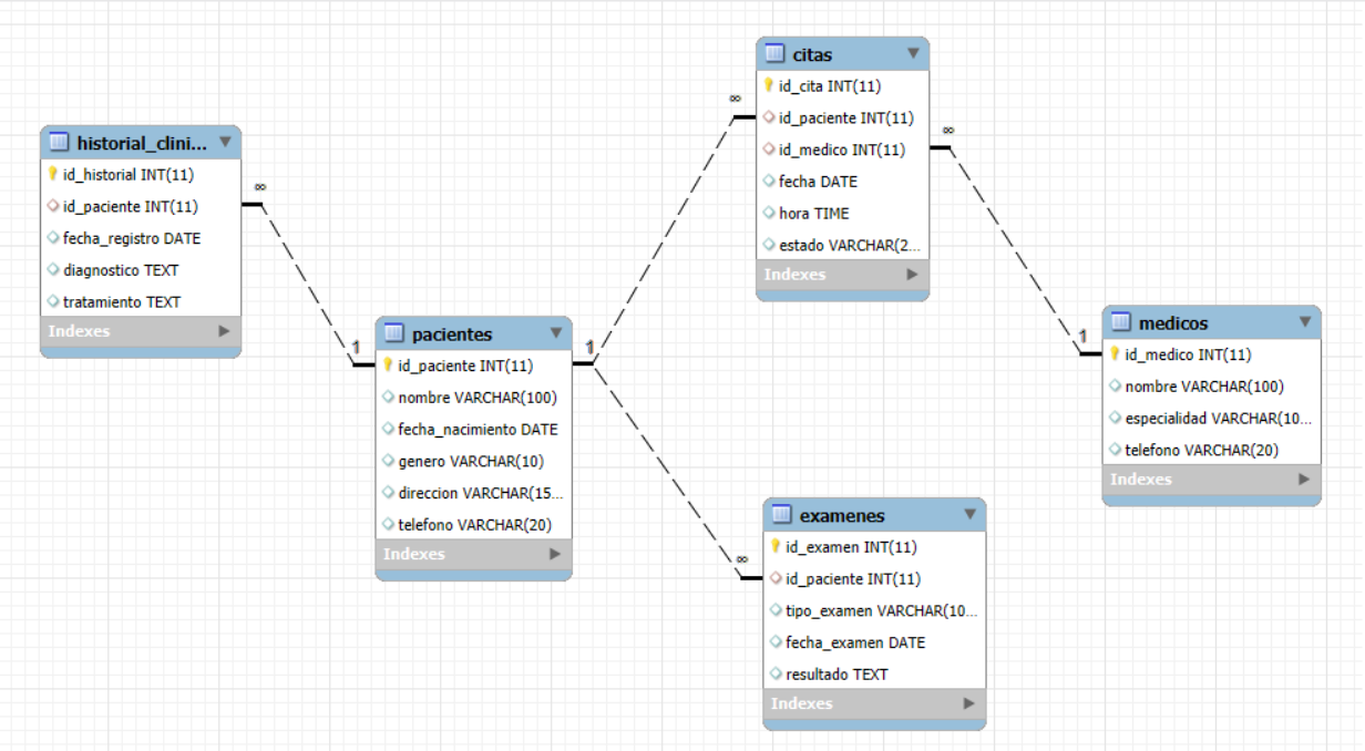 Se creó una base de datos relacional llamada clinica_vida_sana con las siguientes tablas: