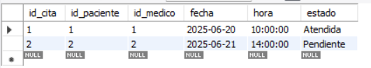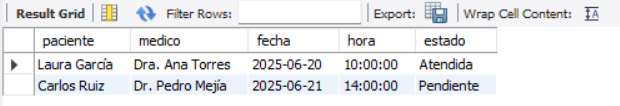 📌 Descripción: Esta consulta permite visualizar qué pacientes tienen citas agendadas, con qué médicos, en qué fecha y hora, y el estado actual de cada cita (pendiente, atendida o cancelada). Es fundamental para la programación efectiva del servicio médico.