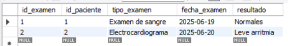 (1, 'Examen de sangre', '2025-06-19', 'Normales'),