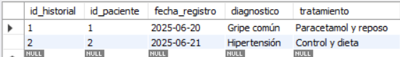 (1, '2025-06-20', 'Gripe común', 'Paracetamol y reposo'),