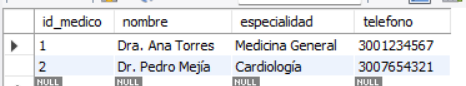 ('Dr. Pedro Mejía', 'Cardiología', '3007654321');