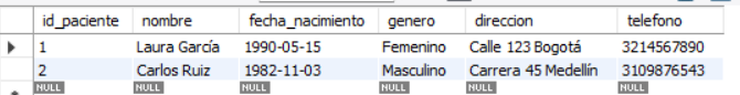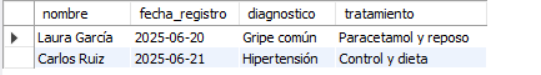 En esta sección se presentan los resultados obtenidos a partir de consultas realizadas sobre la base de datos construida para la Clínica Vida Sana. Estas consultas permiten analizar la información registrada sobre pacientes, citas médicas, exámenes clínicos e historial médico.