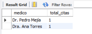 📌 Descripción: Esta consulta permite evaluar la carga de trabajo de cada médico, lo cual es útil para redistribuir recursos humanos, reducir tiempos de espera y optimizar la atención médica.